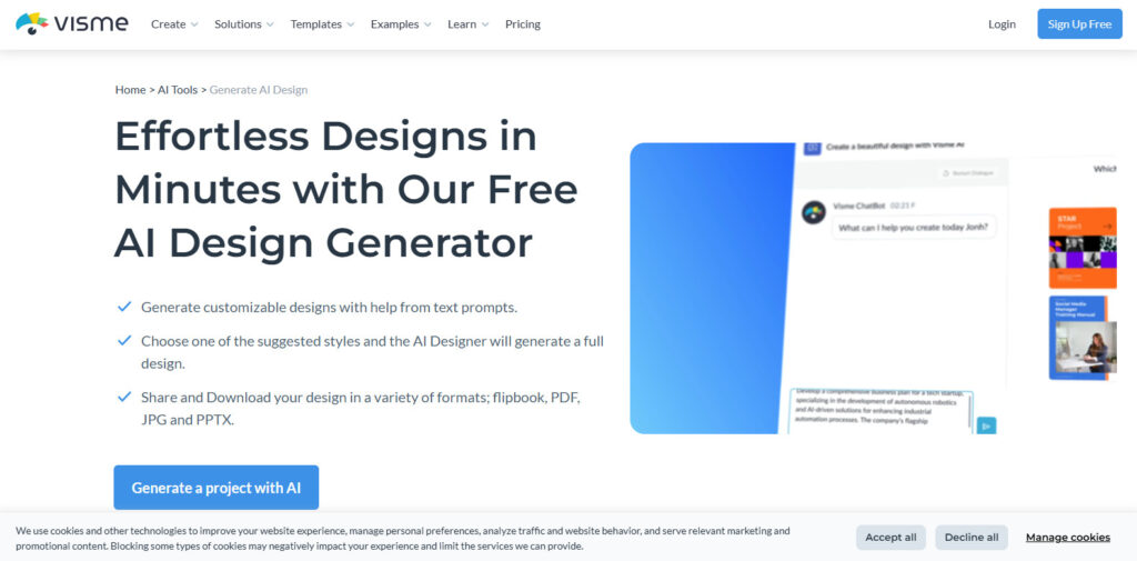 Visme is a full visual content platform with powerful AI capabilities. The AI design generator creates complete presentations, infographics, and reports from simple text prompts.