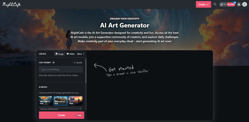 NightCafe offers powerful AI image generation with a generous free tier. The platform supports multiple AI models and styles, giving users creative freedom without immediate costs.
