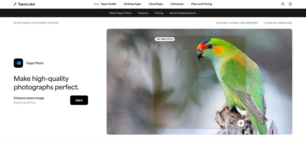 Topaz built their reputation on professional-grade AI enhancement. Photo AI is their latest tool combining gigapixel upscaling, denoising, and sharpening into one application.